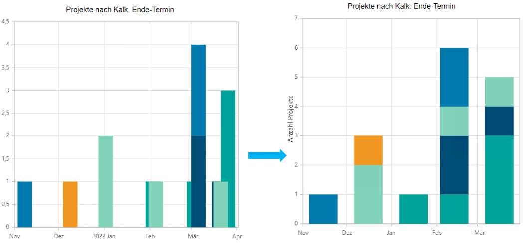 • Will man ein gestapeltes Chart mit Datumswerten bauen und diese pro Monat stapeln, aber die Datumswerte sind nicht am gleichen Tag, werden die Datenpunkte nicht gestapelt.