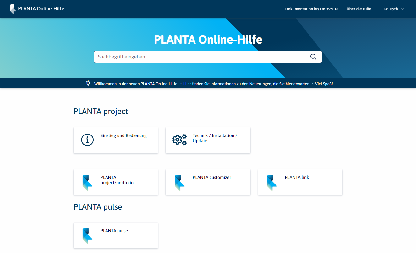 - Ab Release 39.5.17 von PLANTA project und Release 32 von PLANTA pulse ist die PLANTA-Dokumentation in der neuen PLANTA Online-Hilfe verfügbar.