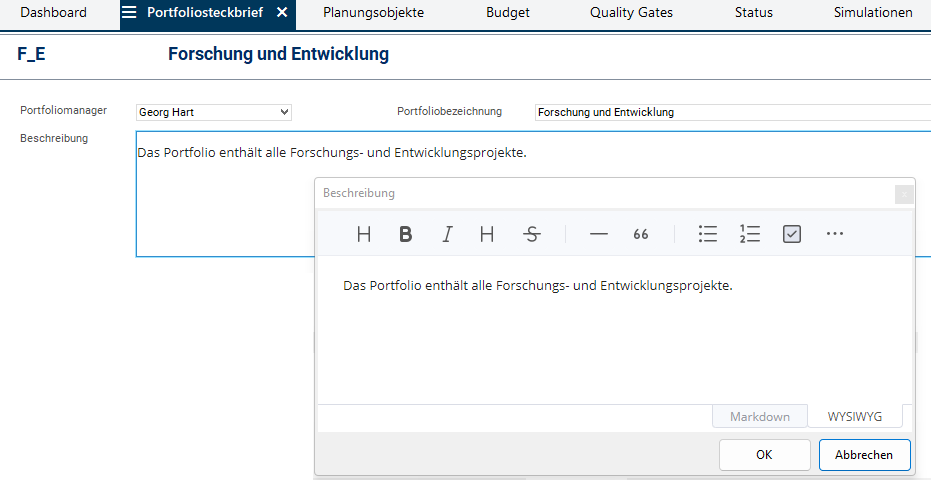 - Das Feld Beschreibung mit einem Editor im Modul Portfoliosteckbrief