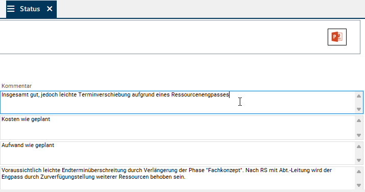 - Das Feld Kommentar ohne einen Editor im Modul Status.