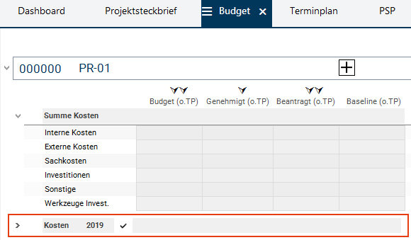 Der Multiprojektmanager sieht in der Spalte Beantragt (o.TP) in der Jahresscheibe des aktuellen Jahres das von der Projektmanagerin für das aktuelle Projekt beantragte Budget. Er möchte es genehmigen.