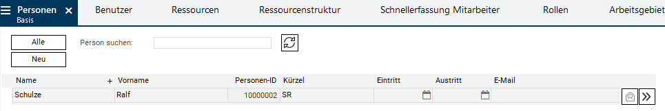 Der Person Ralf Schulze werden drei Eigenschaften (Benutzer, Stakeholder und Personenressource) mit dem entsprechenden Kürzel automatisch zugeordnet.