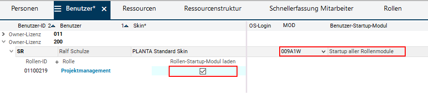 Wenn sich Ralf Schulze in PLANTAprojectanmeldet, soll automatisch das für seine Rolle definierte Startup-Modul geladen werden.
