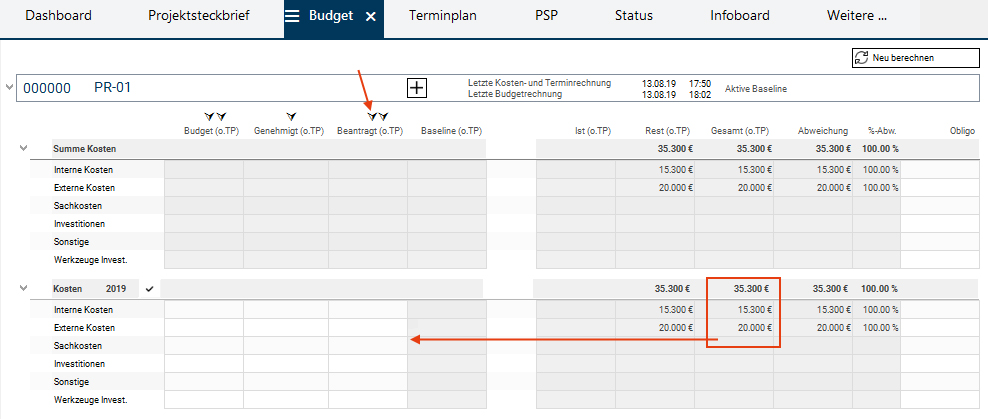 Danach kopiert der Multiprojektmanager die Werte aus der Spalte Genehmigt (o.TP) in die Spalte Budget (o.TP), indem er den rechten Pfeil über der Spalte Budget (o.TP) betätigt. Dann speichert er und betätigt die Schaltfläche Neu berechnen.