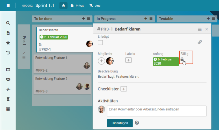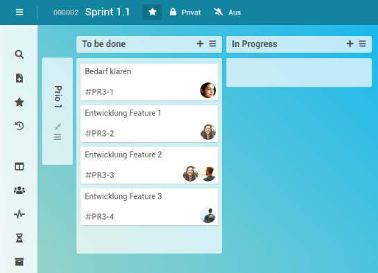 In der Zeile des Vorgangs Sprint 1.1 wird zudem eine statistische Angabe zu den Karten des Boards angezeigt, die sowohl die gesamte Anzahl der Board-Karten (zweite Zahl) als auch die Anzahl der noch offenen (erste Zahl) beinhaltet.