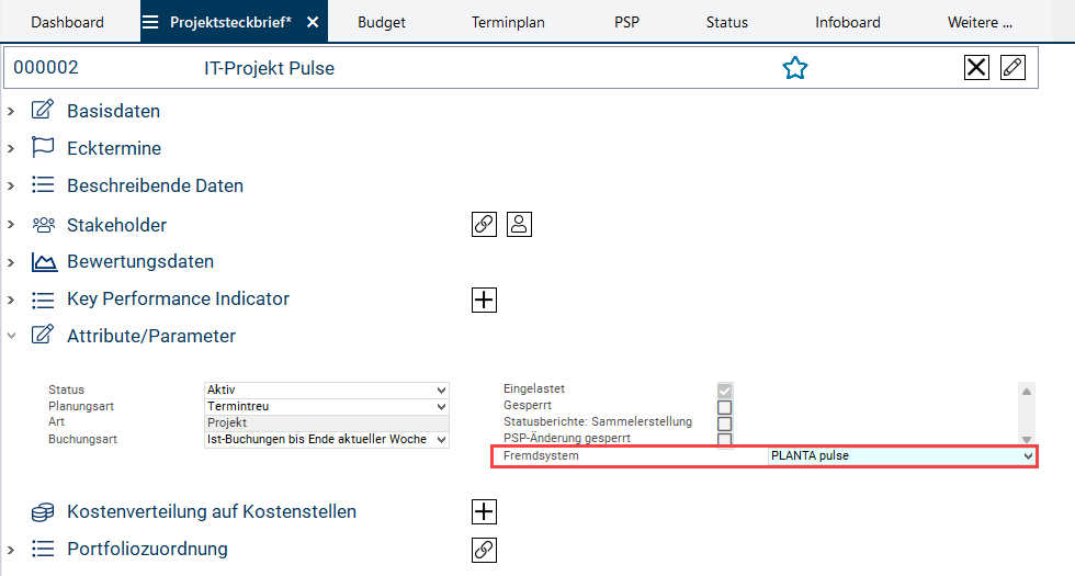 Im Modul Projektsteckbrief im Bereich Attribute/Parameter aus der Listbox Fremdsystem den Eintrag PLANTA pulse auswählen.