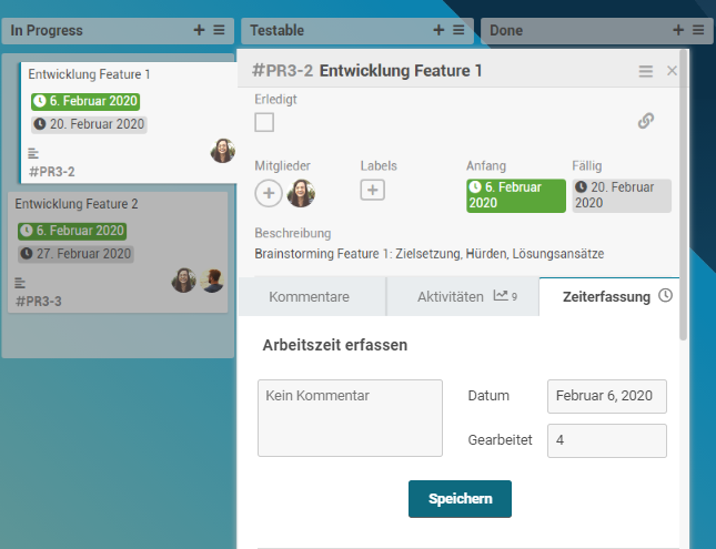 Auf dieselbe Weise auch auf der Karte Entwicklung Feature 2 Stunden erfassen, z.B. "3 h".
