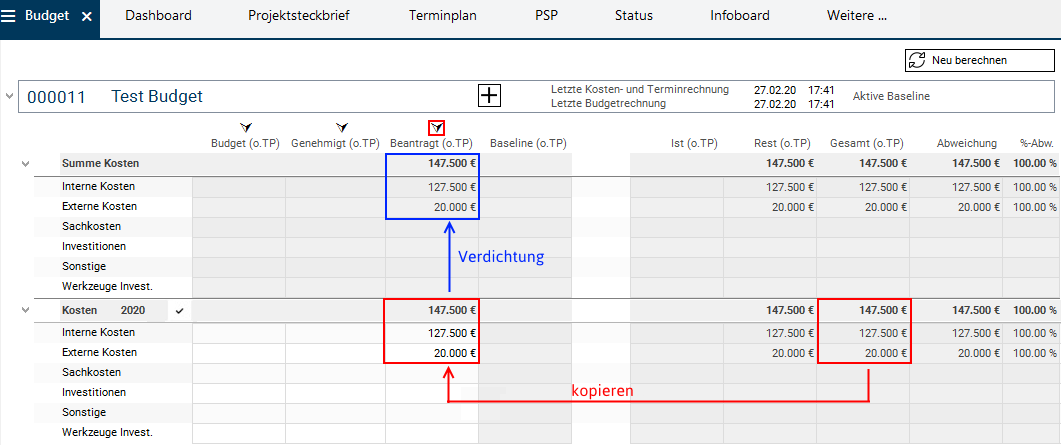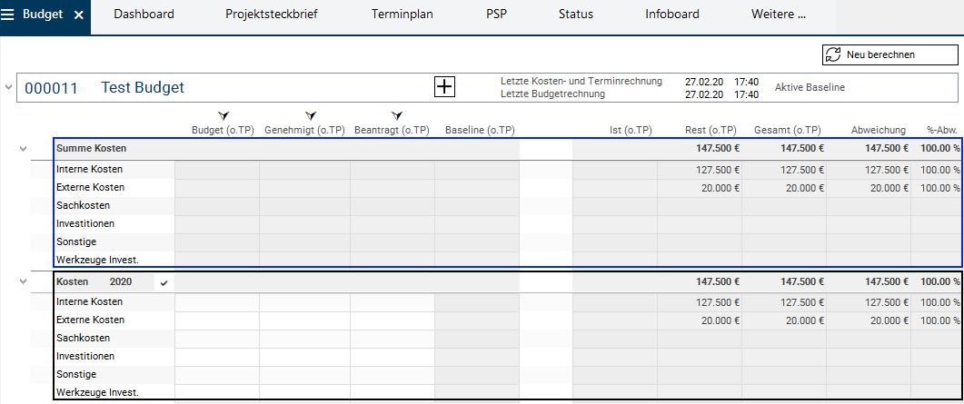 Da das Hauptprojekt in diesem Fall kein eigenes Budget hat, sind die Werte in den Spalten Budget (TP) und Budget gleich.