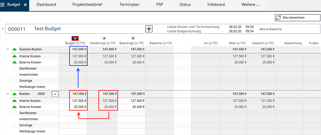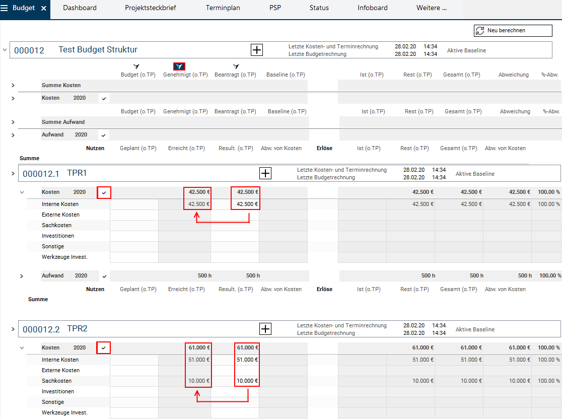 Sobald die Teilprojekte budgetiert wurden (die Spalte Budget (o.TP) in den Teilprojekten gefüllt ist) und die Schaltfläche Neu berechnen betätigt wurde, werden die Budget-Werte entlang der Projektstruktur summiert.