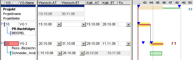 Im PLANTA-Standard werden die Wunschtermine der Vorgänge mit blauen Dreiecken visualisiert.