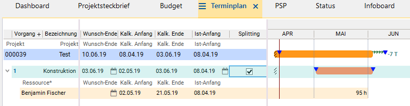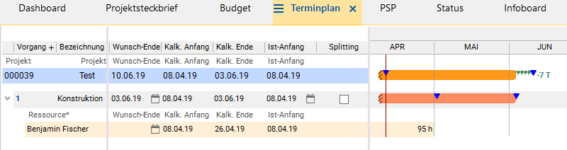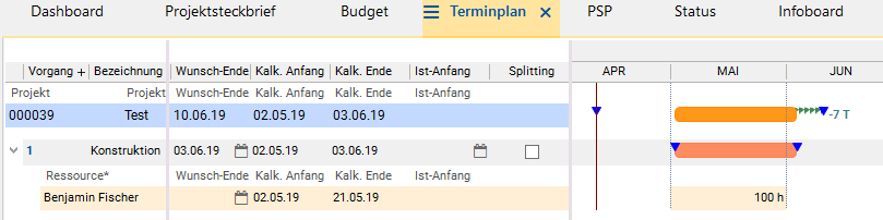 Die Ressource Benjamin Fischer hat auf den Vorgang Konstruktion 5h gemeldet. Der Vorgang ist nicht gesplittet. Nach dem Berechnen des Terminplans ergibt sich folgendes Bild:
