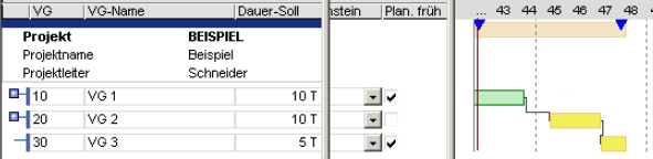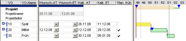 Parameter Planung früh hat auf einem Sammelvorgang keine Auswirkung. Die Sammelvorgänge bekommen ihre Termine von den untergeordneten Vorgängen. Der Parameter Planung früh wirkt auf den untergeordneten Vorgängen genauso wie auf den nicht strukturierten Vorgängen. Haben die untergeordneten Vorgänge sowohl Planung früh = als auch Planung früh = , bekommt der Kalkulierte Anfangvom Sammelvorgang den Frühesten Anfang von allen Untervorgängen und das Kalkuliertes Ende vom Sammelvorgang das Späteste Ende von allen Untervorgängen.