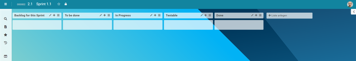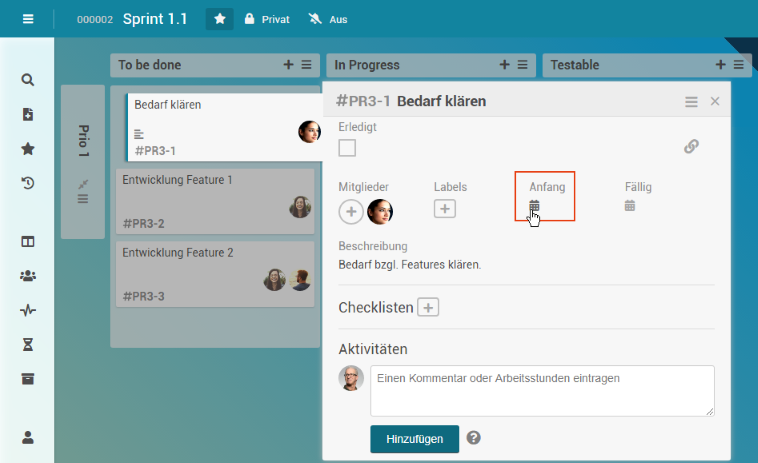In der Zeile des Vorgangs Sprint 1.1 wird zudem eine statistische Angabe zu den Karten des Boards angezeigt, die sowohl die gesamte Anzahl der Board-Karten (zweite Zahl) als auch die Anzahl der noch offenen (erste Zahl) beinhaltet.