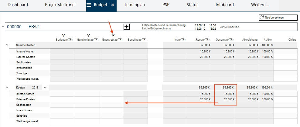 Danach kopiert der Multiprojektmanager die Werte aus der Spalte Genehmigt (o.TP) in die Spalte Budget (o.TP), indem er den Pfeil über der Spalte Budget (o.TP) betätigt. Dann speichert er und betätigt die Schaltfläche Neu berechnen.