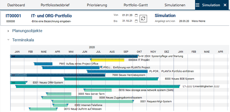 • Mit einer Simulation können verschiedene Auslastungs- und Terminszenarien simuliert werden, um die Projekte des Portfolios mit optimierter Auslastung der Ressourcen durchführen zu können.