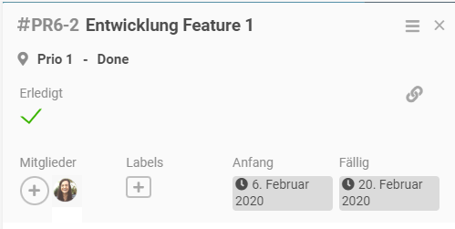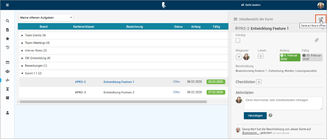 • Mit Klick auf die Bezeichnung Entwicklung Feature 1 öffnet sich die Detailansicht der entsprechenden Karte.