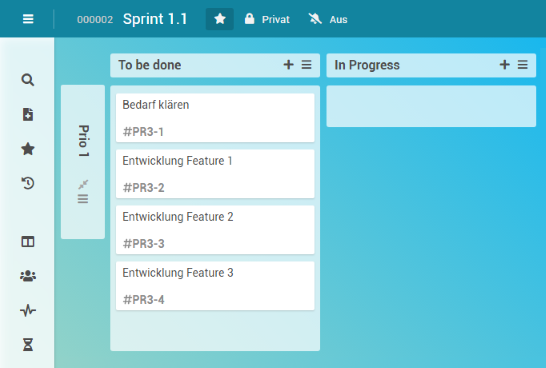 • Georg Hart entscheidet, dass das Feature 3 im Vorgang Sprint 1.1 eine niedrige Priorität hat. Um dies im Vorgangs-Board abzubilden, verschiebt er die Karte Entwicklung Feature 3 in die Swimlane Prio 2.