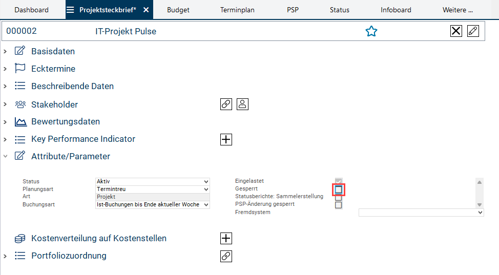 • Im Modul Projektsteckbrief  im Bereich Attribute/Parameter aus der Listbox Fremdsystem den Eintrag PLANTA pulse auswählen.