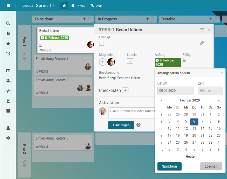 Ein Board-Mitglied kann einer Karte auch zugewiesen werden, indem sein Avatar mittels Drag&Drop von der Sidebar auf die Karte gezogen wird.