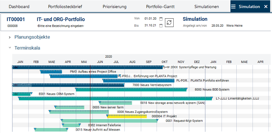 Mit einer Simulation können verschiedene Auslastungs- und Terminszenarien simuliert werden, um die Projekte des Portfolios mit optimierter Auslastung der Ressourcen durchführen zu können.