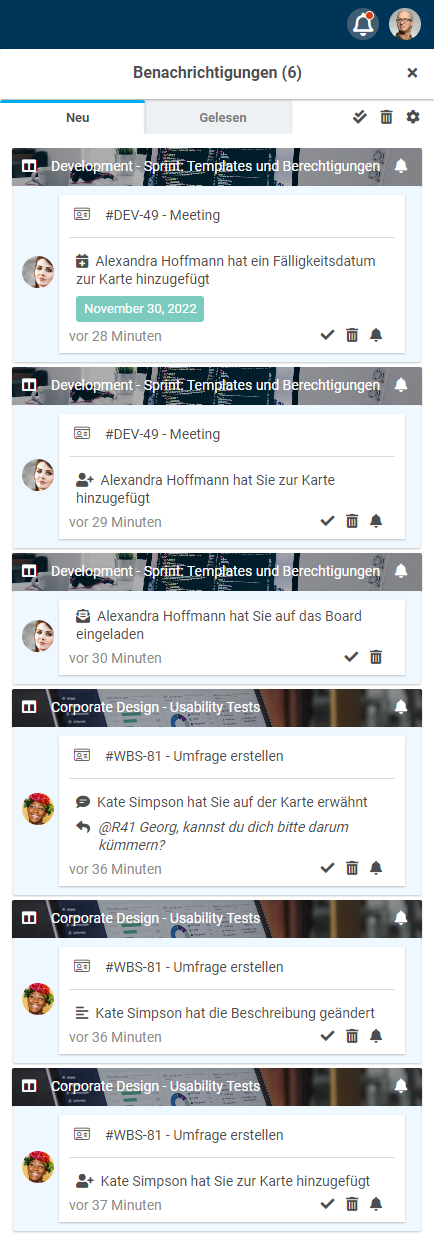 Im Tab Neu werden neue Benachrichtigungen und im Tab Gelesen werden bereits gelesene Benachrichtigungen angezeigt.