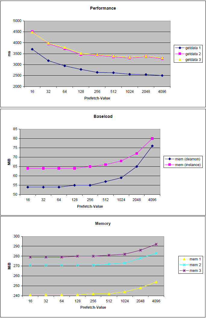 The OCI Prefetch Number tells the Oracle Client Interface how much records of a resultset it should fetch at once. Setting this value low increases the number of roundtrips to the Oracle-Server, setting it high increases the amount of memory OCI reserves and thus the baseload of PLANTA Server. One has to balance the Prefetch Number between those two parameters according to the individual system's latency and memory. As a reference you can use the charts below that are based on data created on a clean system with ~150000 records coming from database-server.