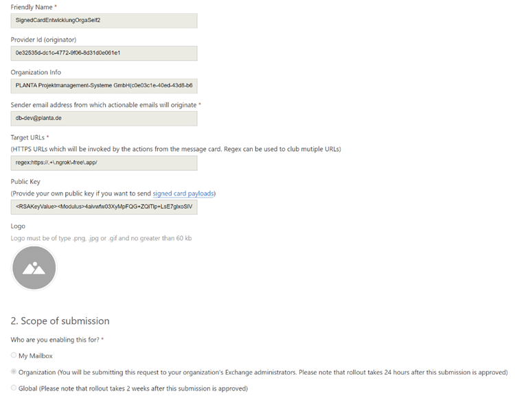 Die “Provider Id” muss im PLANTA project-System in der globalen Einstellung Actionable Message Provider Id (originator) (actionable_message_provider_id) hinterlegt werden, sonst werden die Karten nicht angezeigt.