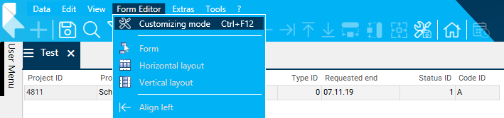 - Activate the customizing mode via Form Editor → Customizing mode.
