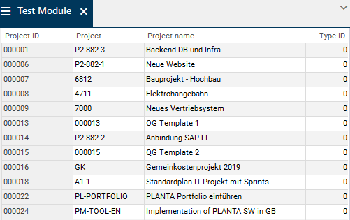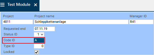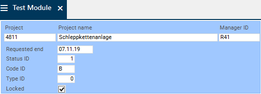 The template contains the mod_obj.menu(11) command in the on_initial_focusPython function. This command refers to menu item 11 Insert, i.e. a blank project record is inserted when the module is opened. A project number can be entered in the record.