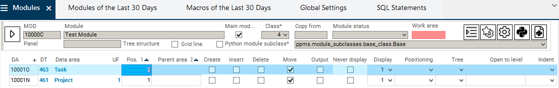 When the newly created Test Module module is opened, it is displayed as a submodule in the customizing panel. In order to open the module in its own panel, activate the Main module parameter.