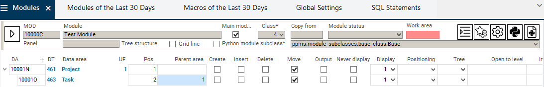 To enable the creation, insertion, and deletion for the Task data area in the Test Module module.