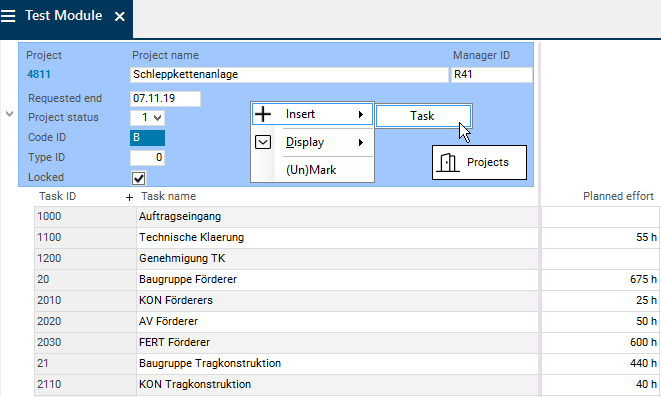For the Project data area, the context menu looks as follows (the DDI originates from DT461 Project and the data area contains a Task subarea for which the Insert and Create parameters are activated): Insert → Task.