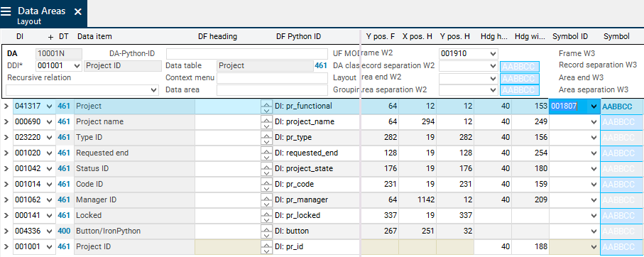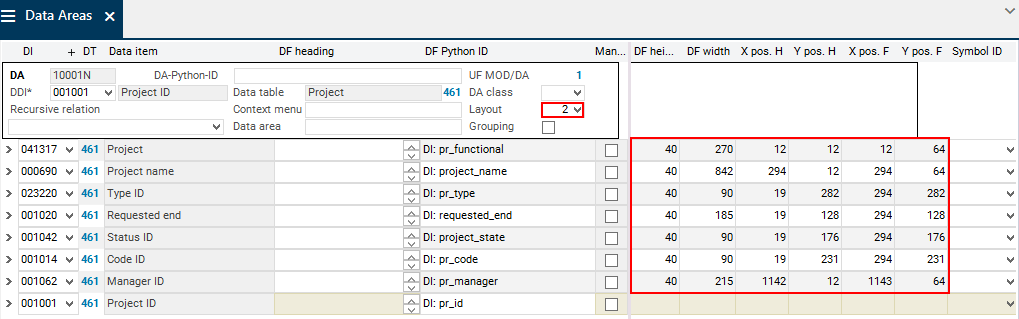The X/Y positions, data field widths, heights, and headings can be edited manually in the Data Areas module; the corresponding parameters can be found in the Layout module variant.
