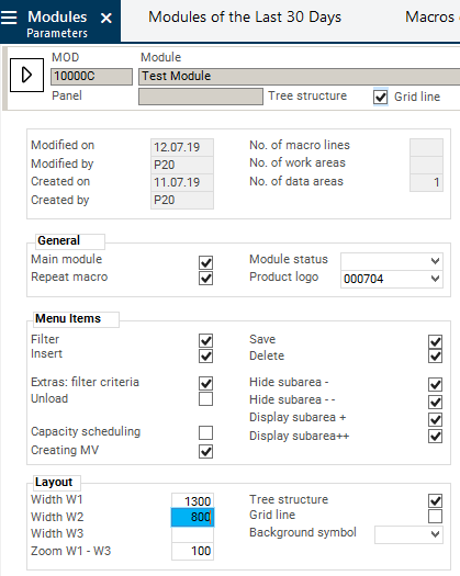 Enter a macro number in the Action ID parameter, e.g. 009A0W Open Planning Object. The module is opened via the macro. This macro defines which data is to be displayed in the module.