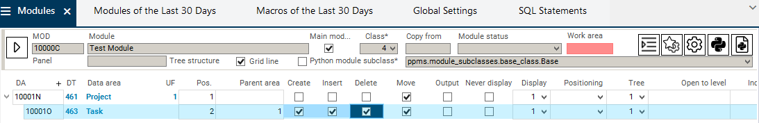 To enable the creation, insertion, and deletion for the Task data area in the Test Module module.