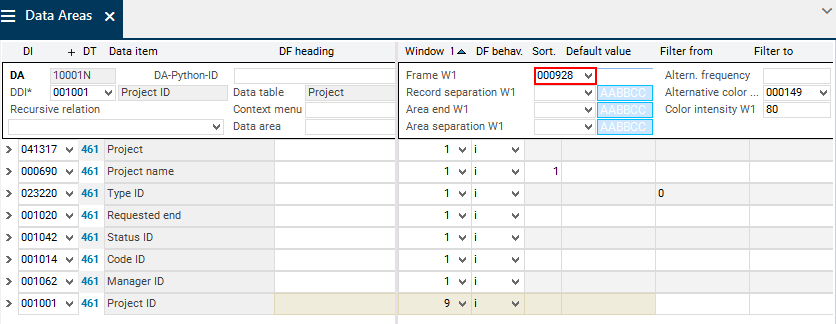 Copy the ID number (001001) of the Project ID data item to the inserted data field by using Drag&Drop copy or select it via the listbox in the DI field.