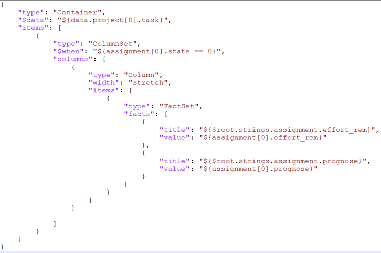 • The templating allows you to build cards in a flexible way. Instead of hard-coding all values, a data object can be referenced in the template, and options like if/else clauses can be used for the context-independent display of data/texts.