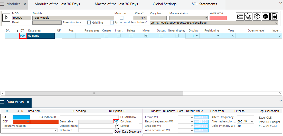 Click on the 000 link in the Data Areas module next to the Data table field or click on the 000 link in the DT field in the Modules module.