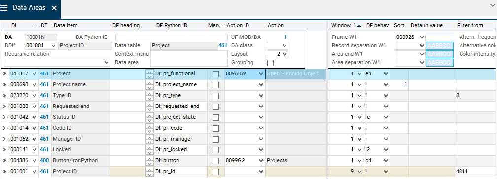 After deleting a data area, you should adjust the Pos. and Parent area data fields accordingly.