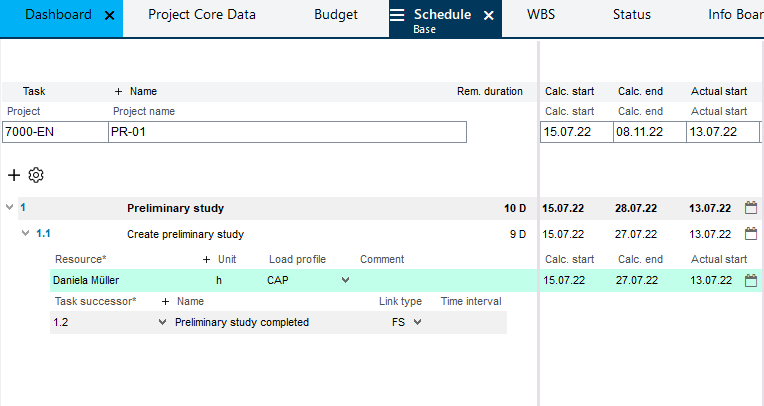 For the Task area, activate fulfillment and enter the numbers of the Resource and Revenue and cost resources data areas separated by the OR=| operator. For the Resource parameter, enter "Daniela Müller" in the Resource area.
