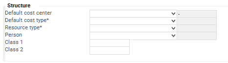 The mandatory Default cost type and Resource type data fields in the Resource Data Sheet administration module.
