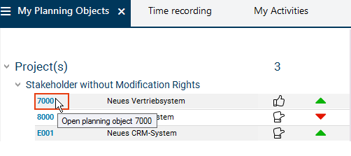 Links to the panels of the recently viewed planning objects (projects, programs, ideas, proposals) and planning objects marked as favorites by the user.