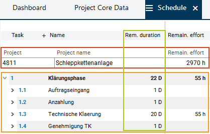The Remaining effort layout column contains a data logical Remaining duration column in the Task area. The Remaining effort layout column, in contrast, consists of two data logical columns: the Remaining effort column of the project record and the Remaining effort column of the task records.