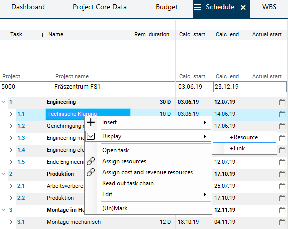 Über das Kontextmenü können untergeordnete Datenbereiche einzeln ein- und ausgeblendet werden, z.B. nur die Ressourcen oder nur die Vorgang-Nachfolger.