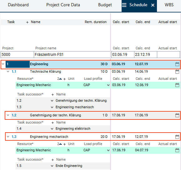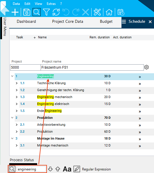 Im Terminplan des Projekts 5000 ist der Sammelvorgang 1 Engineering ausgeklappt (zu erkennen am Pfeil-Symbol ), sodass die ihm untergeordneten Vorgänge (1.1 bis 1.5) angezeigt werden.