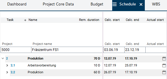 Die Vorgangs-Datensätze 1.1 bis 1.5 sind eingeklappt (zu erkennen am Pfeil-Symbol ), d.h. ihre untergeordneten Daten sind ausgeblendet.