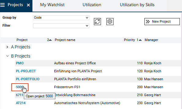Die Projekt-Datensätze sind jetzt nach Managernamen alphabetisch sortiert (Sortierreihenfolge 1).