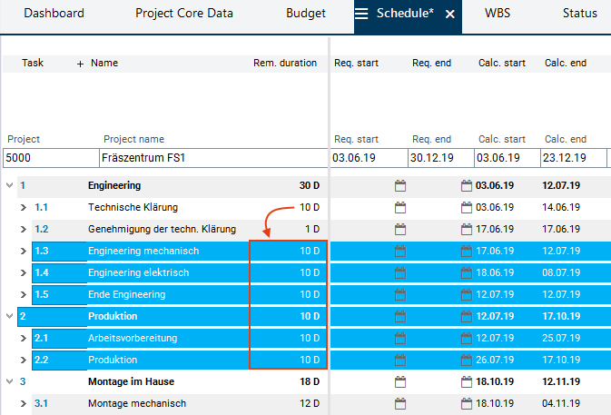 Die Spalte Phase wird nun ausgeblendet und die Spalte Aufwand wird eingeblendet.
