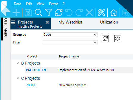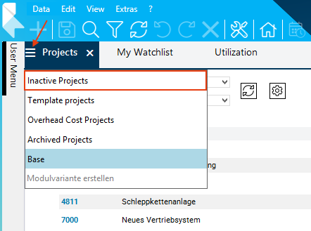 Im Modul Projekte die Modulvariante Inaktive Projekte auswählen.