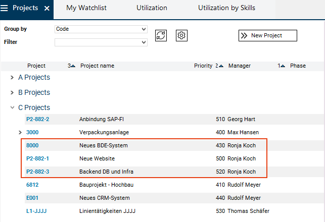 Da es in der Gruppe C-Projekte drei Einträge für die Managerin Ronja Koch gibt, werden die entsprechenden Datensätze (Projekte 8000, P2-882-1 und P2-882-3) untereinander nach ihren Werten in der Spalte Prio (Sortierreihenfolge 2) aufsteigend sortiert.
